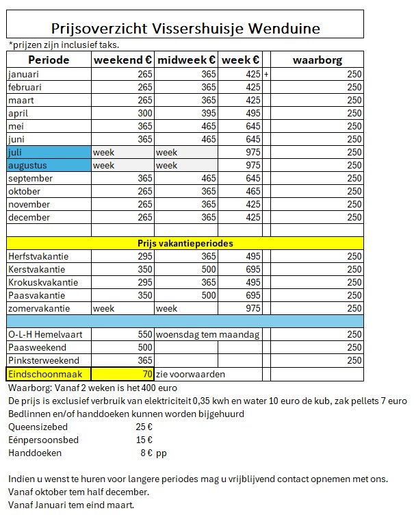 Our calendars show availability by cottage. Prices can be requested by our contact form. Prices are by wknd, midweek or week. During July and August only weekly rental 😊.